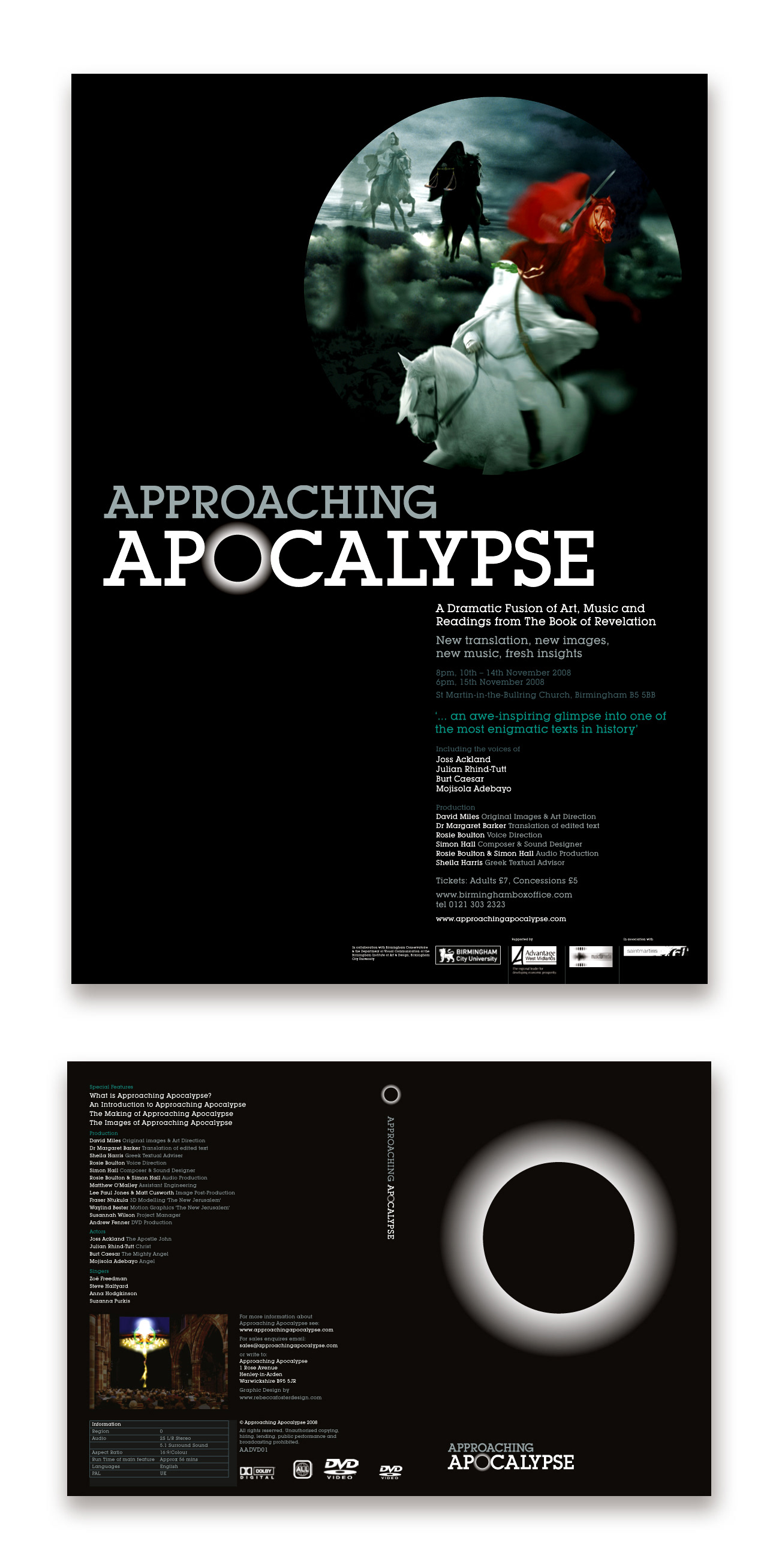 Publicity material, dvd covers and website design for the exhibition and performance Approaching Apocalypse. A collaboration of art, music and readings by artist David Miles, composer Simon Hall and the voices of Joss Ackland and Julian Rhind-Tutt.