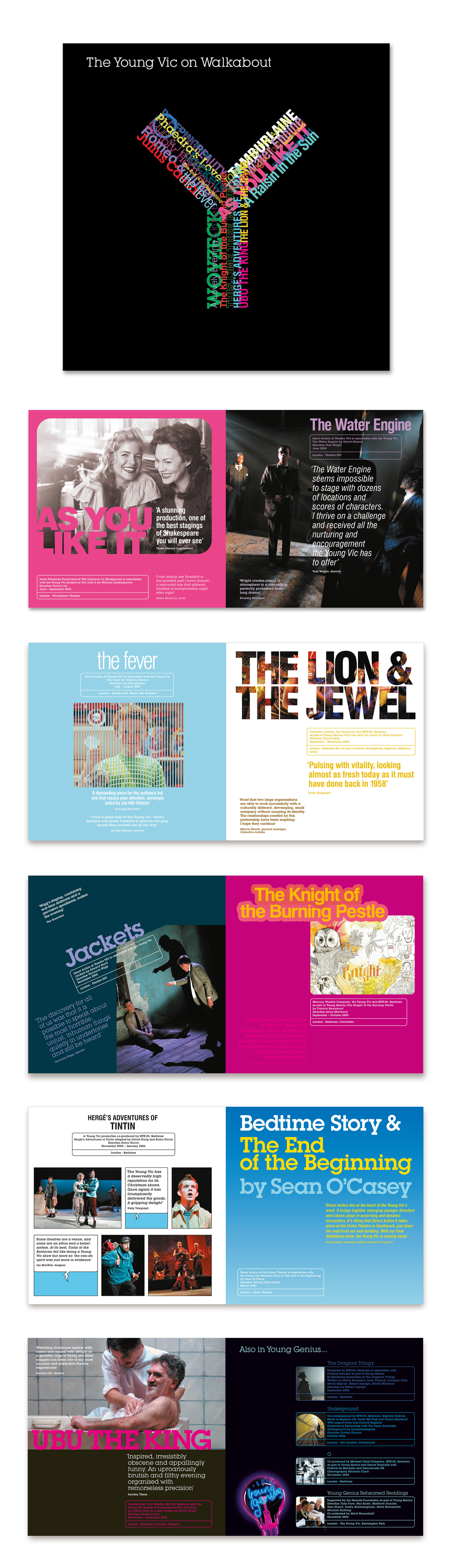 This brochure was designed as a diary and celebration of 24 performances undertaken during just 24 months. The theatre company toured the UK for two years while their home on the southbank was being rebuilt.